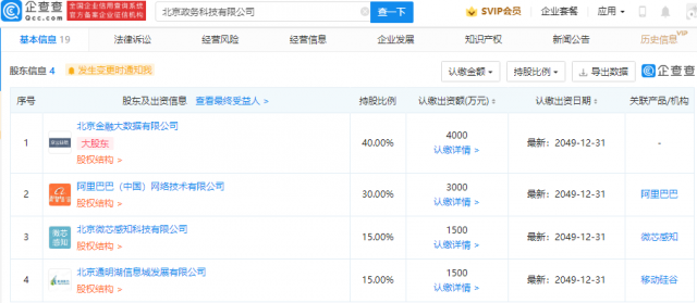 企查查股权穿透显示,该公司由北京金融大数据有限公司、阿里巴巴(中国)网络技术有限公司等共同持股。