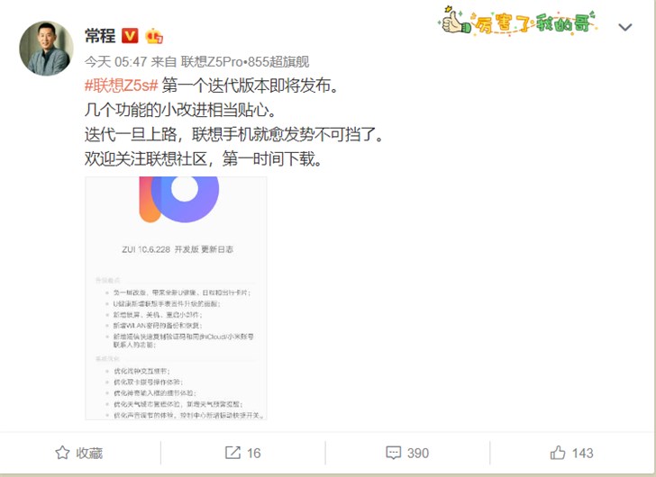 今日凌晨,联想常程发微博称联想Z5s第一个迭代版本即将发布,几个功能的小改进相当贴心,并表示迭代一旦上路,联想手机就愈发势不可挡了。