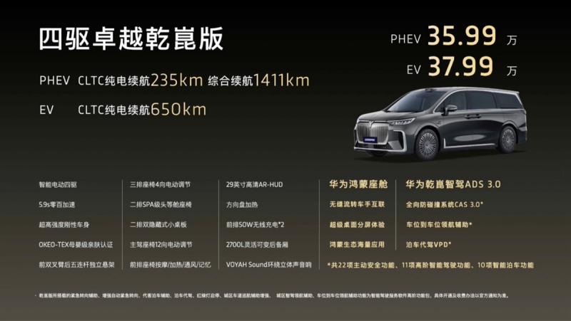 四驱卓越乾崑版:PHEV版35.99 万元,EV版37.99 万元