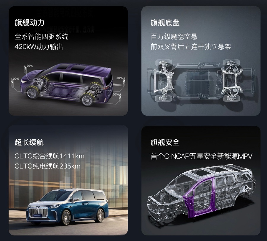 动力方面,新车同样提供插混和纯电两种选择。其中插混版发动机最大功率150马力,综合功率571马力,CLTC工况纯电续航235km,综合续航1411km;纯电版采用双电机四驱,最大功率435马力,纯电续航650km。