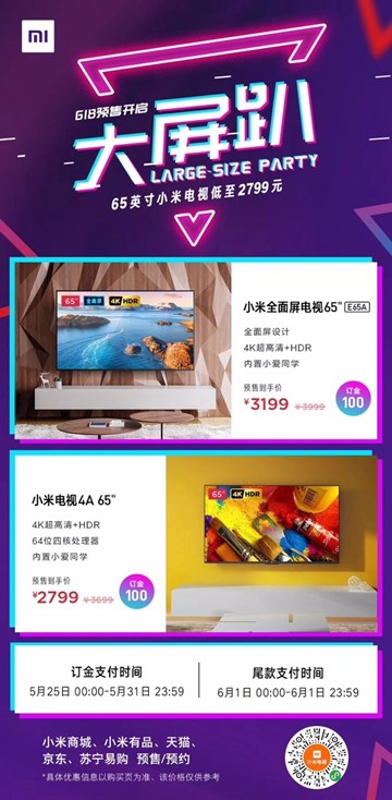IT之家5月28日消息 日前,小米电视已开启“618”预售活动。参与本次活动的产品有小米电视4A 65英寸和小米全面屏电视。参与本次活动需要在5月25日至5月31日支付订金100元,并于6月1日支付尾款。