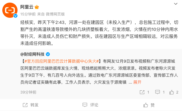 今天下午,阿里云微博发文称:经核实,昨天下午2:43,河源一处在建园区(未投入生产),总包施工过程中,切割产生的高温铁渣导致楼外的几块挤塑板着火,引发浓烟,火情在约10分钟内用水带扑灭,未造成人员伤亡和财产损失。该在建园区与生产区域相隔较远,对云服务未造成任何影响。