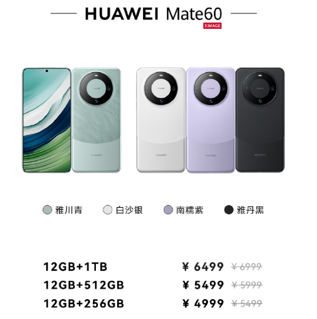 降价后:华为 Mate 60 12GB+256GB 版本 4999 元,12GB+512GB 版本 5499 元,12GB+1TB 版本 6499 元;华为 Mate 60 Pro 12GB+256GB 版本 5699 元,12GB+512GB 版本 6199 元,12GB+1TB 版本 7199 元。