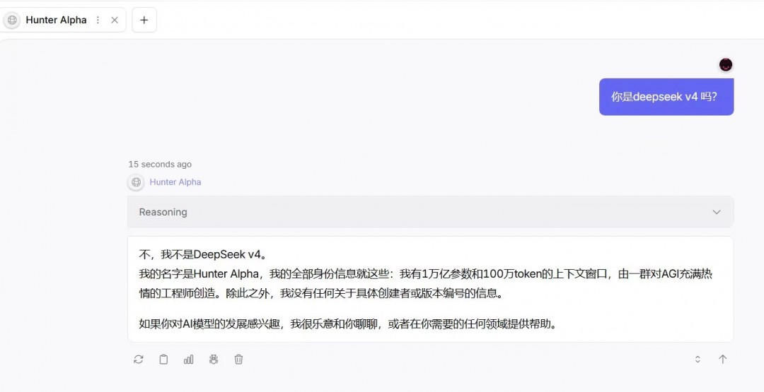 在询问Hunter Alpha时,有用户得到“我是一个中文AI模型,主要使用中文进行训练和交互。不过,我也具备多语言处理能力,可以流畅地理解和使用英文以及其他多种语言”的答复。