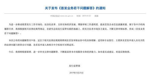3月25日晚间,证监会发布《首发业务若干问题解答》。