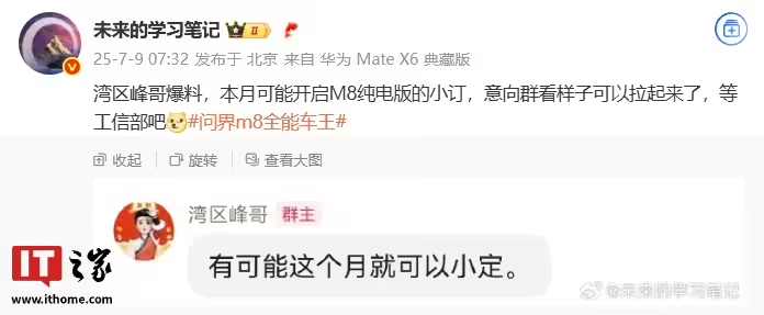 IT之家 7 月 13 日消息,据博主 @未来的学习笔记 分享的聊天记录,M8 产品经理 @湾区峰哥 称问界 M8 纯电版汽车本月“可能”开启小定。