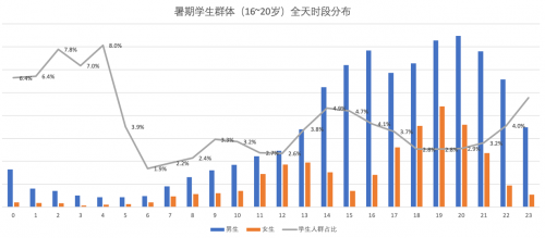 数据显示,在健身时间点上,女生集中在中午和晚上,大约能占到全天的68%;而男生则更加倾向于“错峰健身”,一方面没有工作的束缚、另一方面为了人少方便,所以下午的时段成了他们的心头好,占到了全天的42%左右。乐刻健身“24小时营业”的模式,也为学生们提供了“避暑”新选择。相比于全天其他时段,从晚上11点开始,学生群体的占比迅速提升。