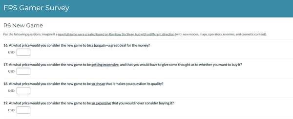 玩家可以按照从“根本没有吸引力”到“十分吸引人”的选项对六种新模式进行评定,并且在紧接着的下一问中被要求回答乐意为《彩虹六号》IP新作支付多少钱。(给的少新作就鸽了鸽了)