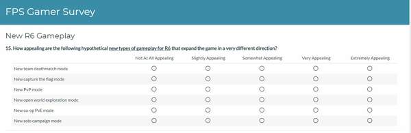 在调查中育碧先询问玩家玩的FPS种类、是否在R6中平等的享受进攻和防守、他们喜欢的游戏模式以及运营商等等。但是随着问卷的推进,名为“《彩虹六号》新游戏模式”的题目向玩家抛出了六种不同的游戏发展方向。