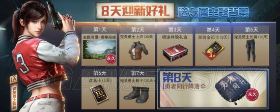 以及连续登录八天送好礼,八天登录好礼中包含完美勇士套装,(其中包含勇者降落伞,前提是必须连续登录八天才可以获得。)