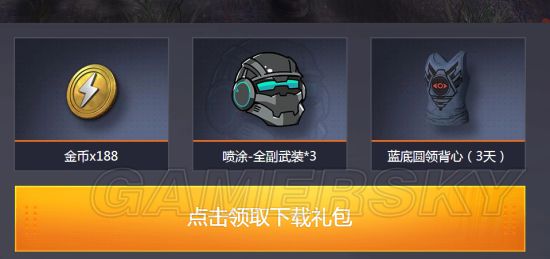 进入官网之后,点击:领取下载礼包,登录游戏账号,进入礼包领取界面。礼包包含金币+喷涂——全副武装+蓝底圆领背心。