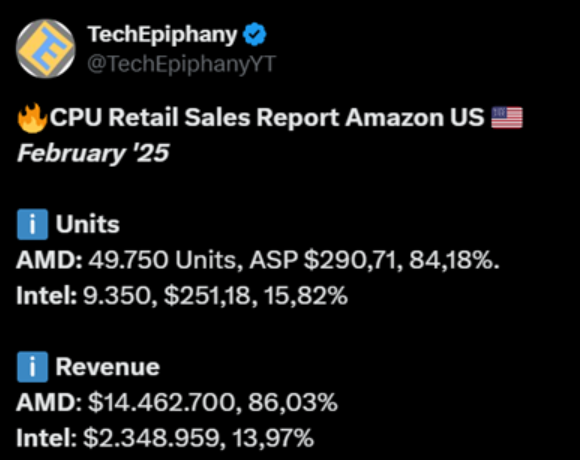 据媒体报道,最新市场数据显示,AMD在2月份美国亚马逊平台上的CPU出货量占比达到了惊人的84.18%,而英特尔的市场份额则缩减至15.82%。这一数据反映了AMD在CPU市场的强劲表现。