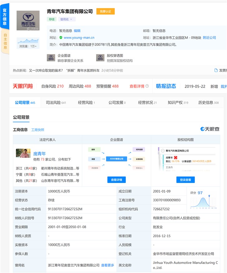 据天眼查数据显示,青年汽车集团有限公司成立于2001年1月,注册资本1亿元人民币,法定代表人为庞青年,该公司共有34次被列为失信被执行人,最新一次为今年的2月25日,失信具体情形为有履行能力而拒不履行生效法律文书确定义务,执行标的为53184788。