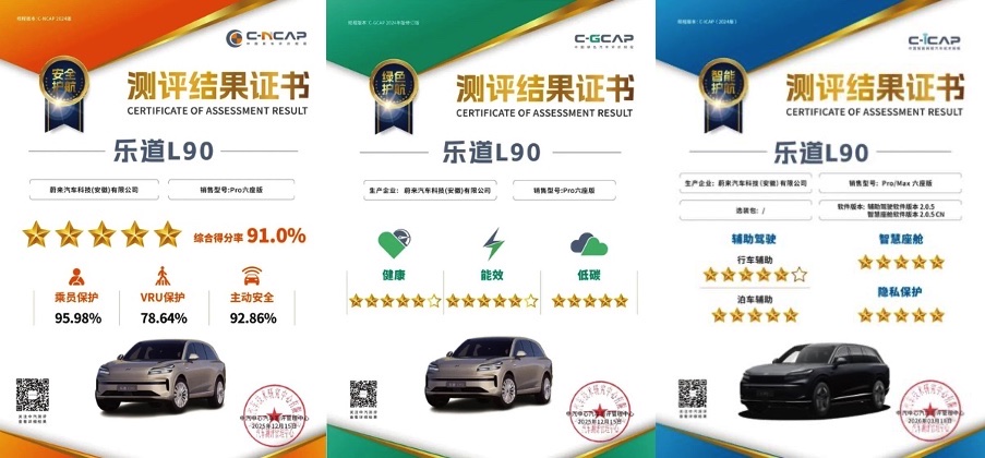 乐道L90获中汽中心三项五星认证 成首个C-NCAP/C-GCAP/C-ICAP大满贯大型SUV汽车