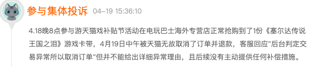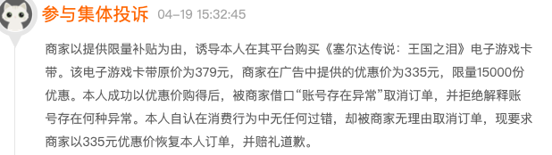 有消费者表示:商家以提供限量补贴为由,诱导本人在其平台购买《塞尔达传说:王国之泪》电子游戏卡带。本人成功以优惠价购得后,被商家借口“账号存在异常”取消订单,并拒绝解释账号存在何种异常。