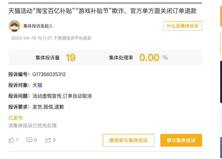 目前,在社交网络上,有大量网友表示自己有同样的遭遇。比如在黑猫投诉平台上,「天猫活动“淘宝百亿补贴”“游戏补贴节”欺诈,官方单方面关闭订单退款」引发了集体投诉。