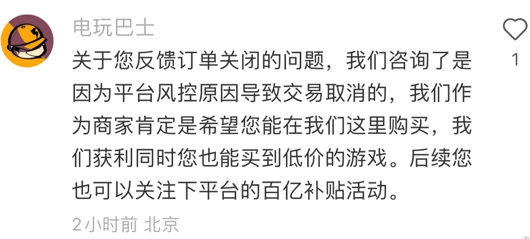 那么此次事件,到底是商家反悔,还是天猫自己的问题呢?根据消费者提供的电玩巴士的回复。电玩巴士表示是因为平台风控原因导致交易取消的。