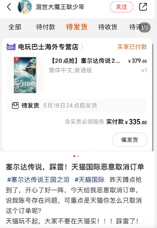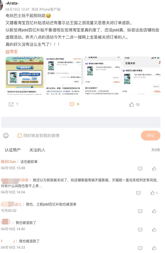 比如有用户表示:玩不起别玩哈,又蹭着淘宝百亿补贴活动还有塞尔达王国之泪流量又恶意关闭订单退款……现在觉得淘宝真是废了,纵容这些店铺玩虚假活动,网上一搜,全是被关闭订单的人。