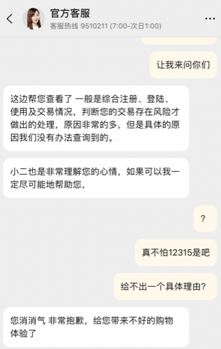 一堆套话下来,客服最终表示:判断您的交易存在风险才作出处理,原因非常的多,但具体的原因我们没有办法查询到。