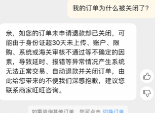 这样的回复,像是说了原因,但又不知道说了什么。总之,订单就是被关闭了,但是没有具体的原因。