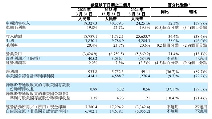如果去除第一季度所获得的利息及投资收益等,理想汽车今年一季度则出现了经营性亏损,经营利润为-5.8亿元,经营利润率为-2.3%。相较之下,去年四季度,理想汽车经营利润为30亿元,经营利润率为7.3%。