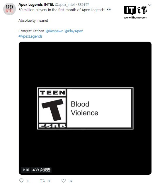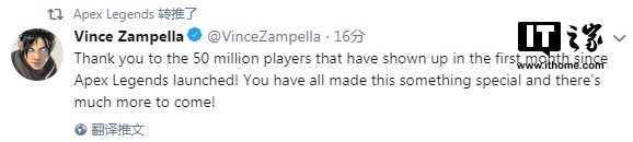 开发商Respawn的CEO Vince Zampella也发推向玩家表示感谢:“感谢大家让《Apex英雄》在发布仅一个月后就突破了5000万名玩家!你们让这一切变得很特别,未来我们还会推出更多内容!”