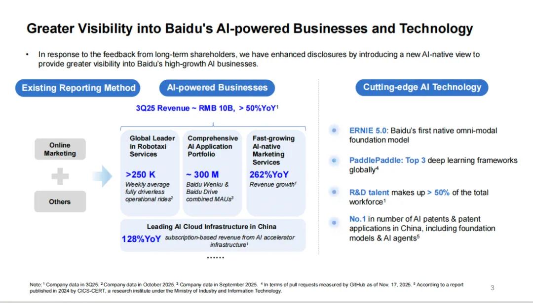 继阿里之后,11月18日晚的百度2025年第三季度财报会上,该公司CFO何海建表示,自2023年3月发布文心一言以来,百度在AI领域的投入已超过1000亿元人民币。