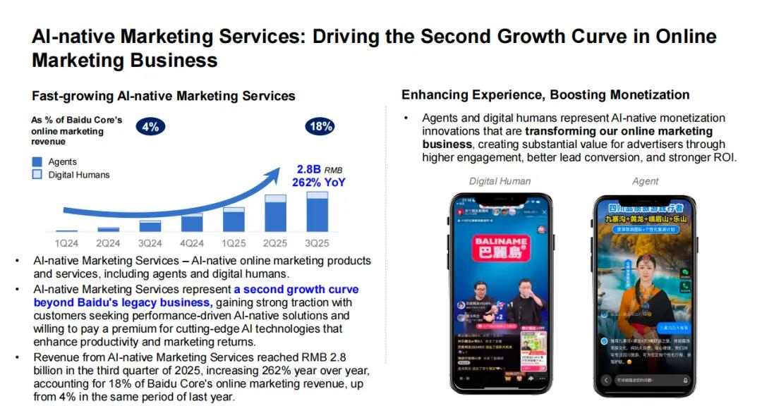 三季度,AI原生营销服务收入达到28亿元人民币,同比强劲增长262%,占百度核心在线营销收入的18%。而一年前同期,这个比例还只有4%。