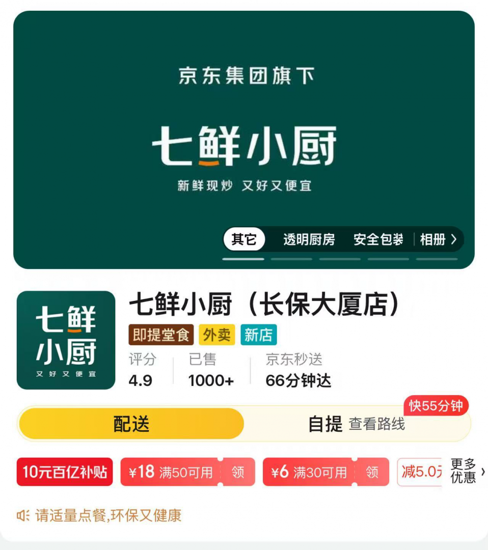 公开信息显示,京东外卖的自营新模式已落地北京,该门店命名为“七鲜小厨”,采取“外卖+自提”结合的无堂食经营形式,目前已试运行1周。
