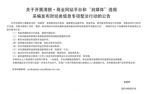 针对近期网上屡屡发生的“自媒体”歪曲解读经济政策、唱衰唱空金融市场、造谣传谣、敲诈勒索等违法不良现象,优酷自2021年8月27日起,开展为期两个月的“清朗·商业网站平台和自媒体违规采编发布财经类信息专项整治行动”,特别针对以下自媒体账号的违规行为进行集中打击: