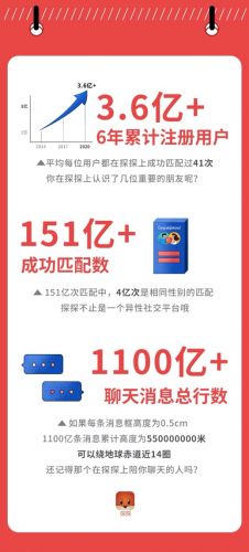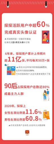 过去6年间,探探用户共上传照片超11亿张,相当于每天上传超50万张,而2020年平均每日新增照片超100万张,接近6年均值的2倍。