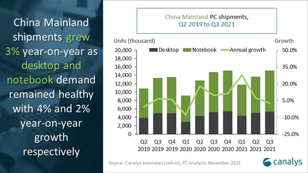 调研机构Canalys送出的第三季度中国PC市场出货报告显示,该季度PC出货超过1500万台,相比去年同期增长了3%,而这其中包含了台式机、笔记本等。