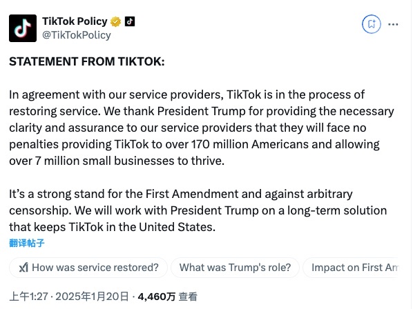 【TechWeb】1月20日消息,今日,TikTok在X平台发布声明称,正在恢复对美国用户的服务,并将与美国当选总统特朗普合作制定一项长期解决方案,让TikTok继续“留在美国”。
