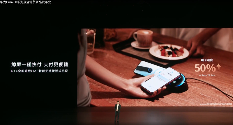 在刷卡速率方面,华为以“支付宝碰一下”为演示案例,在此前的基础上进一步缩短了时间。华为Pura 80系列手机采用iTAP协议,熄屏“碰一下”后点击支付,即可解锁手机完成支付。