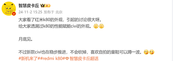 据悉,全新的Redmi K80系列将在11月与大家见面,此前Redmi总经理王腾暗示该系列会涨价。更多详细信息,我们拭目以待。(Suky)