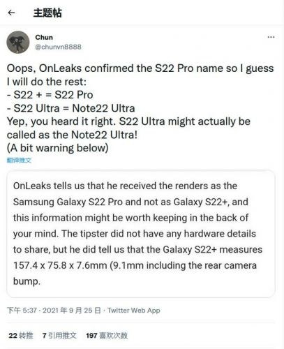 据海外知名爆料达人Chunvn8888最新发布的信息显示,与此前大家熟知的三星Galaxy S22 Ultra的命名方式不同,该机将可能将被正式命名为Galaxy Note22 Ultra,这也进一步印证了之前所有关于该机将采用Note系列的设计元素的爆料。与此同时,Galaxy S22+的命名也将有所改变,将被称为S22 Pro。