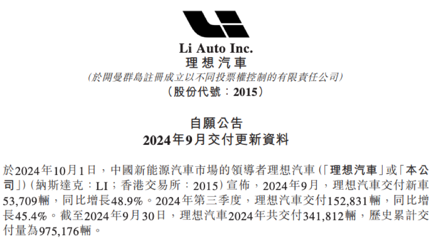 截至2024年9月30日,理想汽车2024年共交付341812辆,历史累计交付量为975176辆。