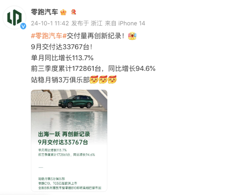零跑汽车9月交付33767辆,创新高,海外销售网点年底达350个