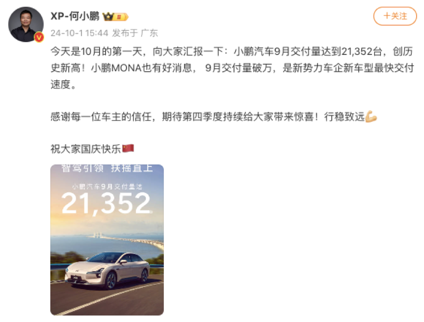 小鹏汽车9月交付21352辆,创新高
