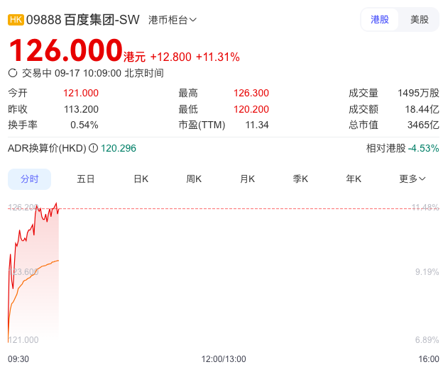 【TechWeb】9月17日消息,继16日美股收盘百度涨超7%后,今日港股开盘,百度股价一路上涨,截至发稿涨11.31%,报126港元/股。