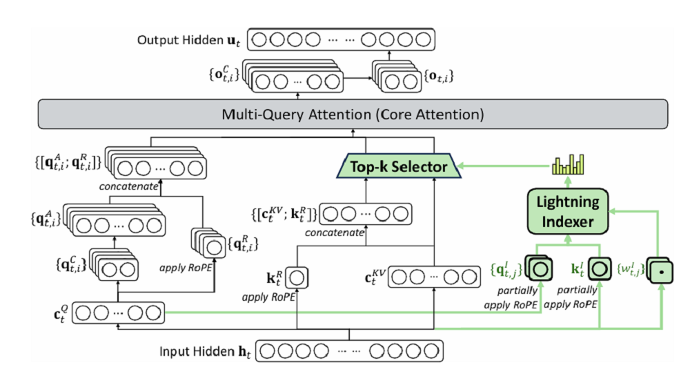 DeepSeek-V3.2-Exp是一个实验性版本,作为迈向新一代架构的中间步骤,在V3.1-Terminus的基础上引入了DeepSeek Sparse Attention(一种稀疏注意力机制)。
