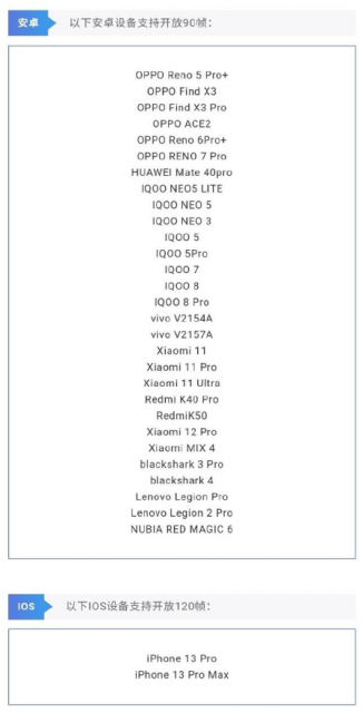 值得一提的是,备受玩家期待的高帧率模式也于今日正式开放,从设备名单来看,大部分高性能手机都将成为首批支持90帧的机型,另外,得益于120Hz自适应刷新率屏幕,iPhone 13 Pro、iPhone 13 Pro Max还将成为首批支持120帧模式的机型。