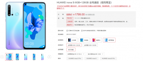 惊喜之一是华为nova5i带来全新色系——烟雨青蓝,这款颜色透露出浓浓的浪漫文艺气息;惊喜之二则是在1999元价位档,限时直降200元,以1799元超值价成功引起了年轻消费者的注意,成为双十一1500-2000元手机价位段销量爆款机型。