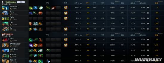 本局对线期局势和前两局大致相同,VP劣势路和中路再次被打穿,只剩下的RAMZeS666的巨魔战将发育正常,但VG本局将一号位换成了更加稳定和扎实的恐怖利刃,在VG的一波经济碾压下,RAMZeS666的巨魔战将也独木难支,眼看翻盘无望,VP在22分钟果断打出GG。