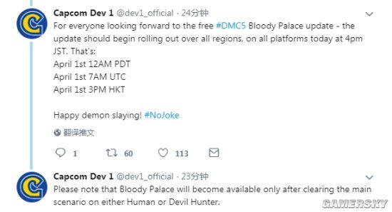 今天虽然是愚人节,但卡普空对于之前承诺过的事当然不会当作玩笑,所以4月1日今天《鬼泣5》血宫模式将正式免费上线,卡普空官方也在推特公布了更新时间,今天下午3点大家就能玩到这个模式了。