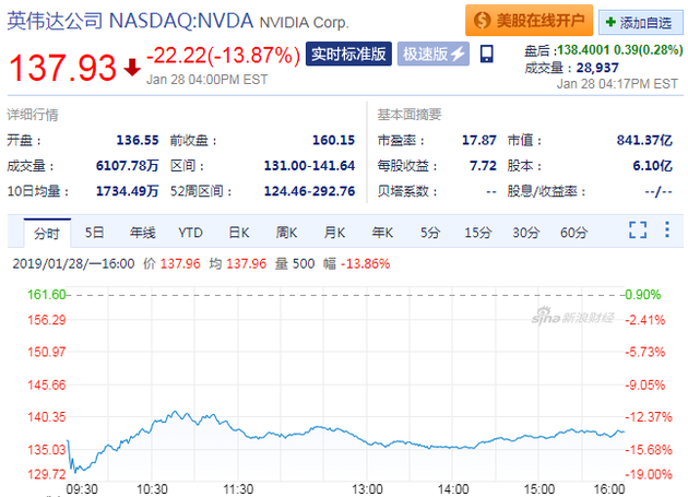 截至当地时间周一收盘时,英伟达报137.93美元,跌幅达13.87%,市值841.37亿美元。当天盘后交易中下跌0.37%,至137.50美元。