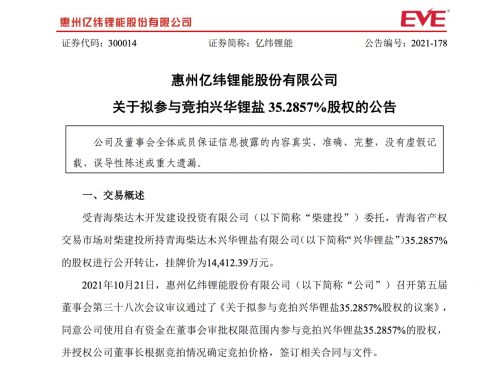 据亿纬锂能公告,公司召开第五届董事会第三十八次会议审议通过了《关于拟参与竞拍兴华锂盐35.2857%股权的议案》,同意公司使用自有资金在董事会审批权限范围内参与竞拍兴华锂盐35.2857%的股权,并授权公司董事长根据竞拍情况确定竞拍价格,签订相关合同与文件。