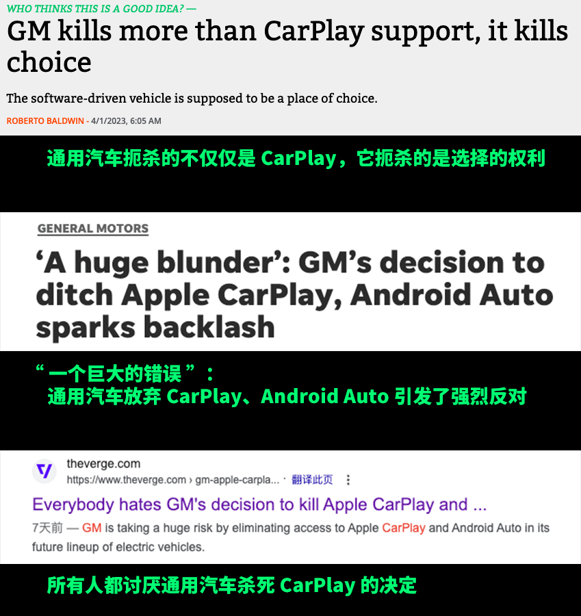 不过啊,通用阉割 CarPlay 的新闻一出,我都不说大家伙,看看媒体们的态度就知道有多不得民心了。