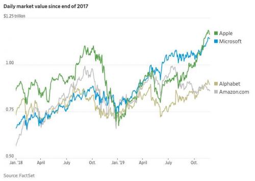 如今,苹果和微软的总市值超过2.3万亿美元,跑赢了市场中的许多其他对手,股价的飙升让他们领先亚马逊公司、谷歌母公司Alphabet。