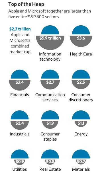 同时,道琼斯市场数据显示,苹果和微软的总市值还超过了标普500指数中197家最小公司的总和,比该指数中的消费者必需品、材料、房地产以及公用事业类股市值都要高。